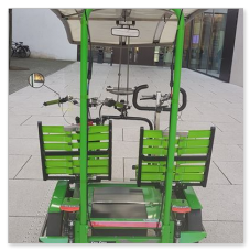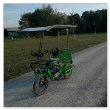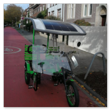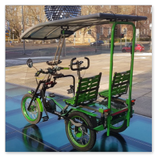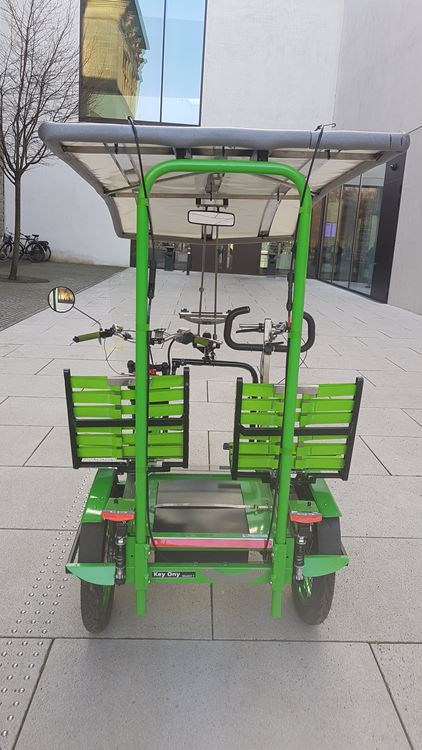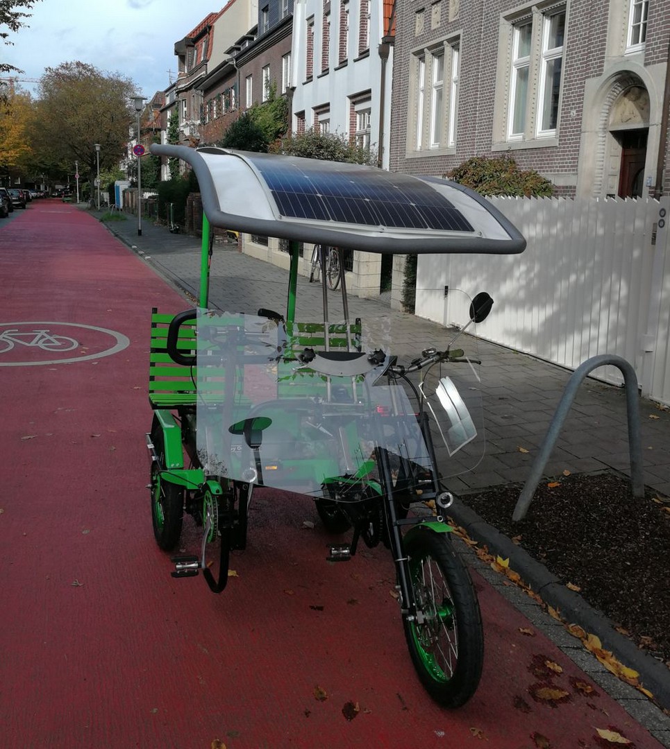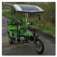 Das Allwetter Dach ist mit Gummidämpfern flexibel montiert, ein 175W Solarmodul lädt bei sonnigem Wetter die Akkus des Dreirad Tandem s .Ein Laderegler sorgt für die richtige Ladespannung.